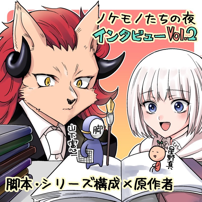 『ノケモノたちの夜』原作者の星野真先生と一緒にアニメ制作の裏側を探るインタビュー企画。第2段は、シリーズ構成を担当した脚本家の山下憲一さん! 作品の魅力だけでなく、物語作りという共通の立場からのお話は必見!(※少々ネタバレを含みます)